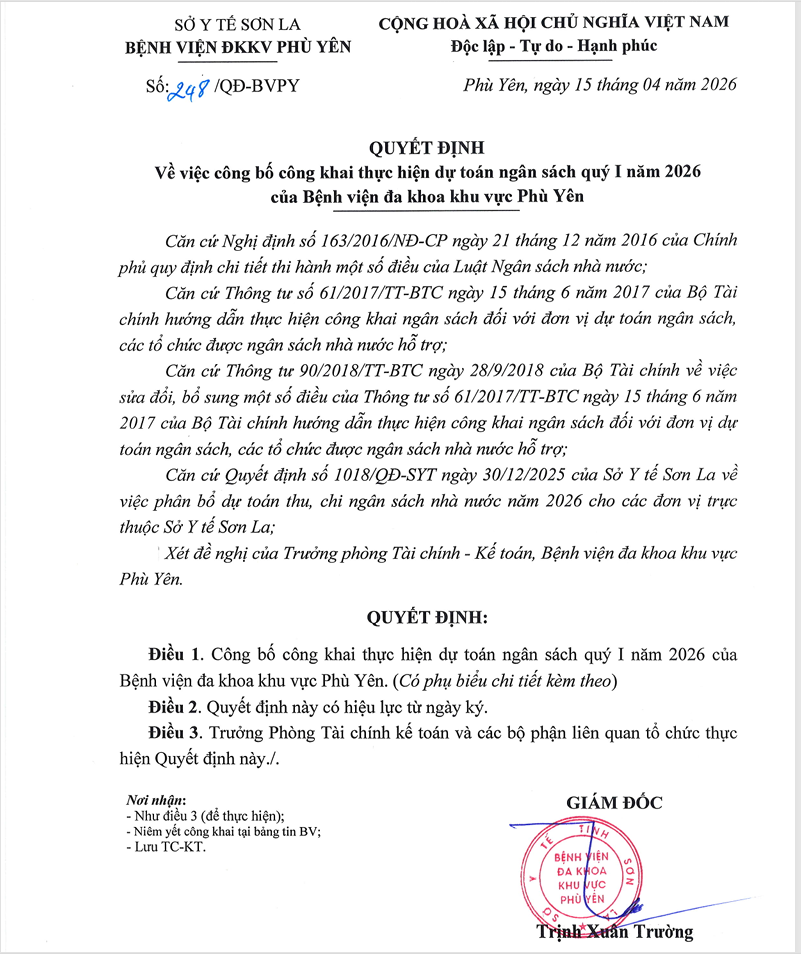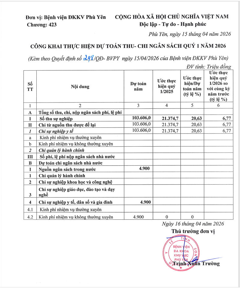 Quyết định: V/v công bố công khai thực hiện dự toán ngân sách quỹ I năm 2026 của Bệnh viện đa khoa khu vực Phù Yên