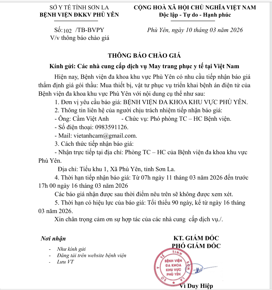 Báo giá thẩm định giá: Mua thiết bị, vật tư phục vụ triển khai bệnh án điện tử của Bệnh viện đa khoa khu vực Phù Yên