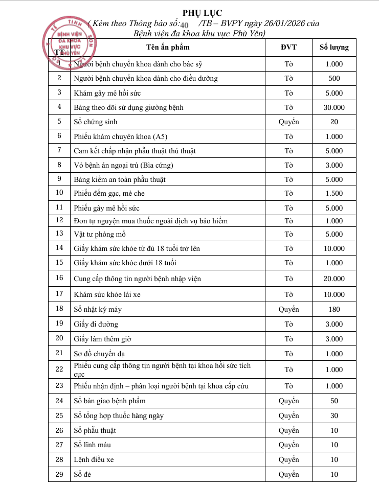 V/v in ấn chỉ, sổ sách phục vụ công tác chuyên môn của Bệnh viện đa khoa khu vực Phù Yên