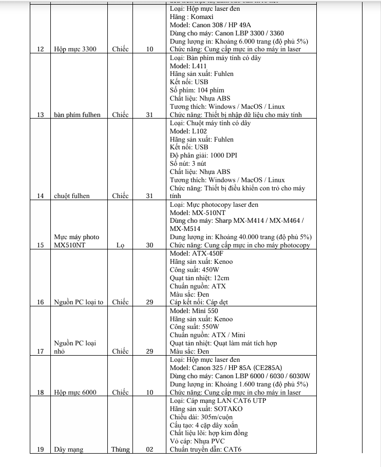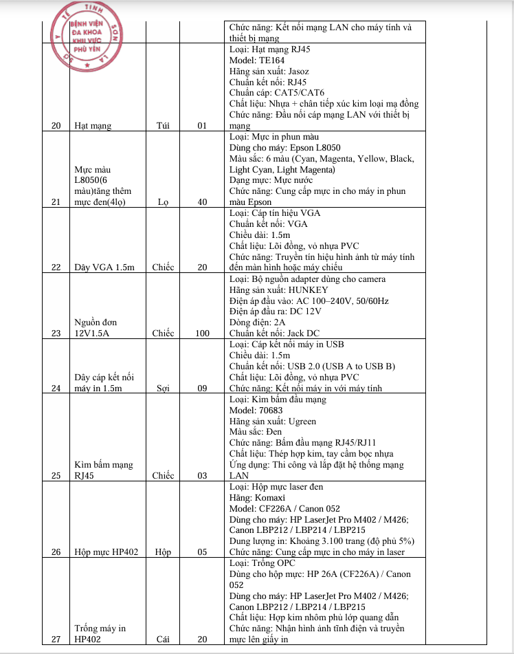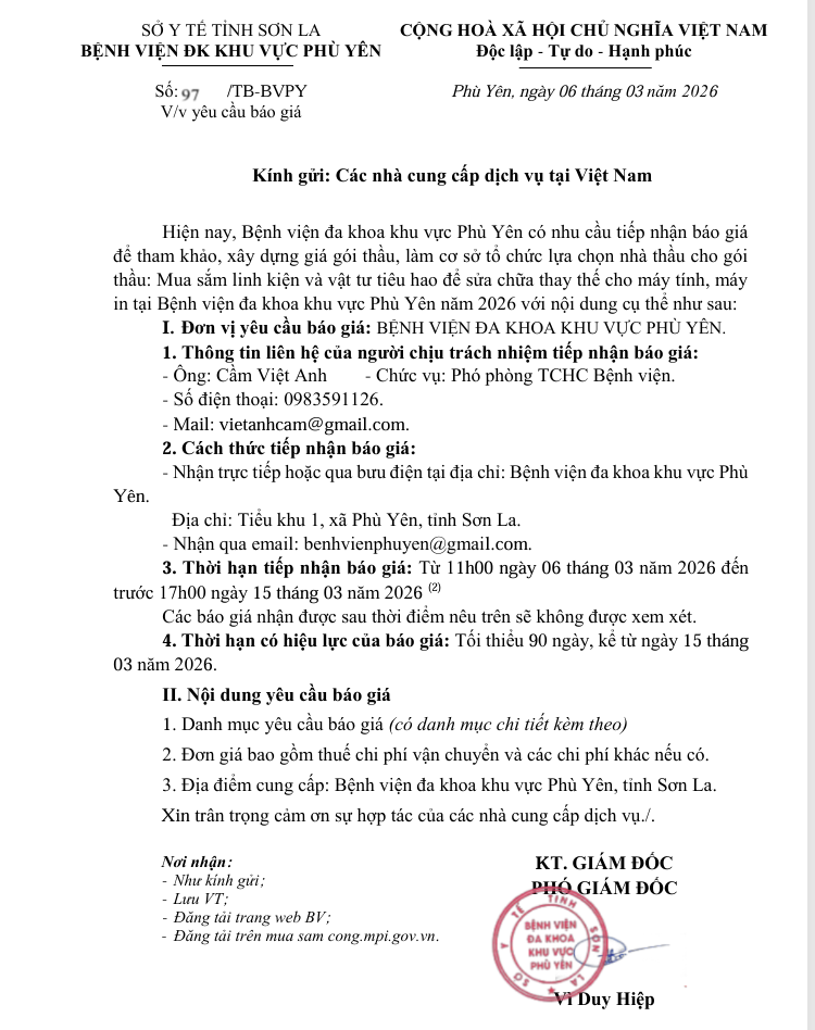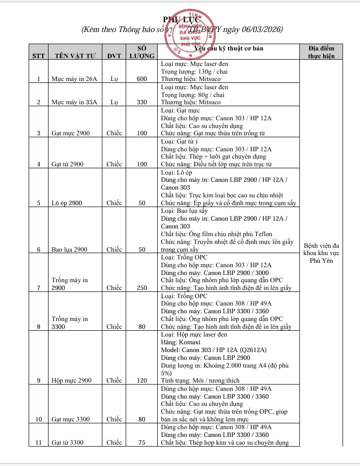 V/v Mua sắm linh kiện và vật tư tiêu hao để sửa chữa thay thế cho máy tính, máy in tại Bệnh viện đa khoa khu vực Phù Yên năm 2026