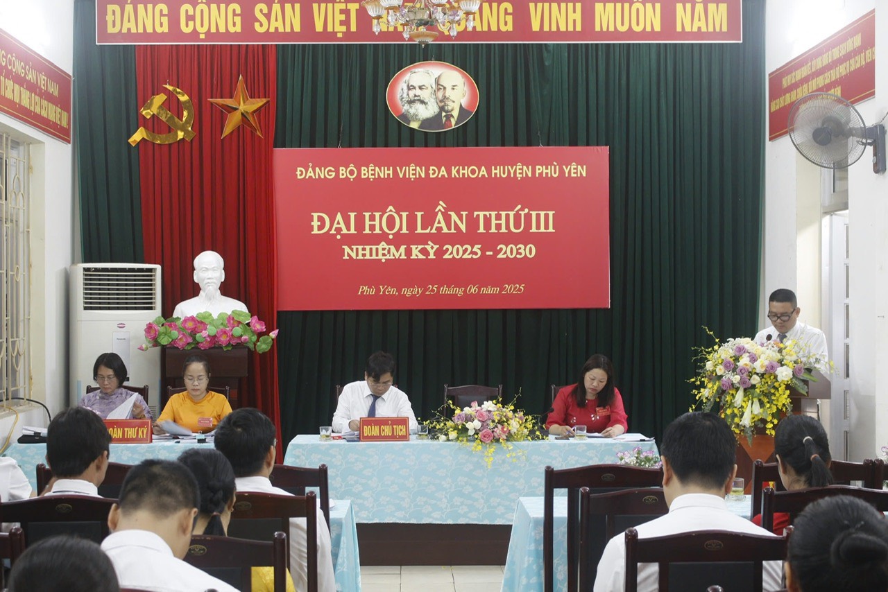 🌟 Hòa chung không khí sôi nổi chào mừng Đại hội Đảng các cấp tiến tới Đại hội Đại biểu toàn quốc lần thứ XIV của Đảng. Ngày 25/06/2025, Đảng bộ Bệnh viện đa khoa huyện Phù Yên đã long trọng tổ chức Đại hội Đảng bộ lần thứ III nhiệm kỳ 2025 - 2030. Đây là sự kiện chính trị quan trọng của Bệnh viện. Đại hội đã kiểm điểm, đánh giá kết quả thực hiện Nghị quyết Đại hội nhiệm kỳ 2020 - 2025, đồng thời đưa ra định hướng Đảng chiến lược phát triển toàn diện nhất trong nhiệm kỳ 2025 - 2030.
