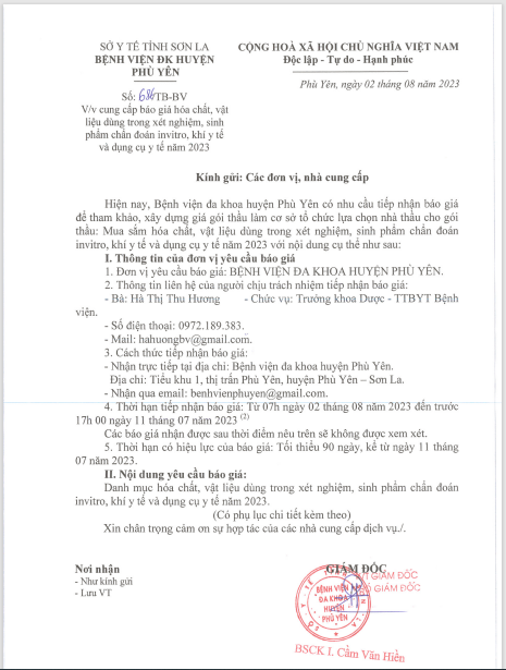 Cung cấp báo giá hoá chất, vật liệu dùng trong xét nghiệm sinh phẩm chẩn đoán invitrol, khí y tế và dụng cụ y tế năm 2023