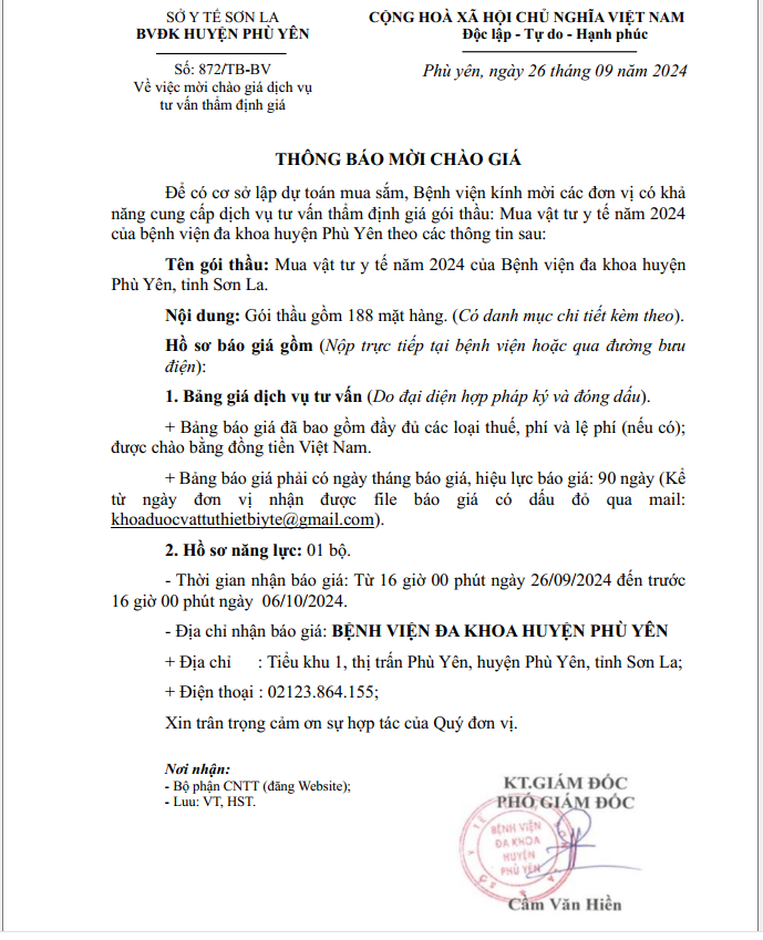V/v mời chào giá dịch vụ tư vẫn thẩm định giá ( Có phụ lục đính kèm theo)