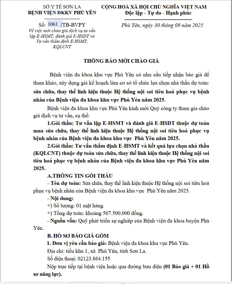 V/v mời chào giá dịch vụ tư vấn lập E-HSMT, đánh giá E-HSDT và tư vấn thẩm định E-HSMT, KQLCNT