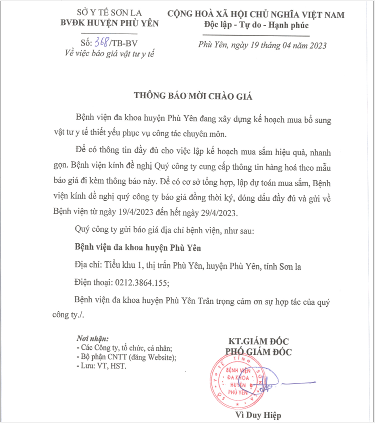 THÔNG BÁO CHÀO GIÁ VẬT TƯ Y TÉ
