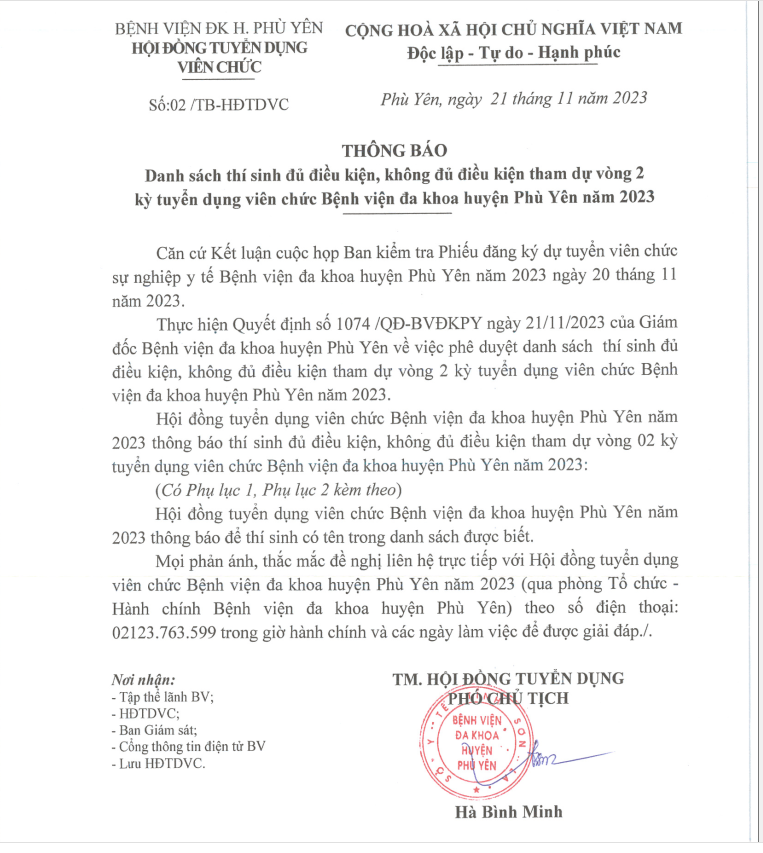 THÔNG BÁO: DANH SÁCH THI SINH ĐỦ ĐIỀU KIỆN, KHÔNG ĐỦ ĐIỀU KIỆN THAM DỰ VÒNG 2 KỲ THI TUYỂN DỤNG VIÊN CHỨC CỦA BỆNH VIỆN ĐA KHOA HUYỆN PHÙ YÊN NĂM 2023