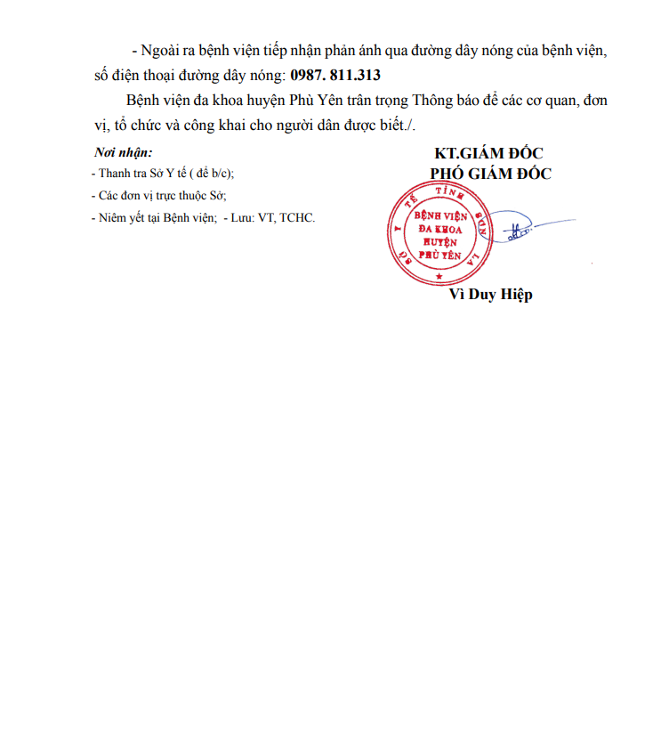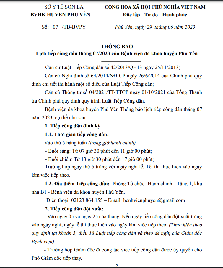 THÔNG BÁO LỊCH TIẾP CÔNG DÂN THÁNG 7/2023 CỦA BỆNH VIỆN ĐA KHOA HUYỆN PHÙ YÊN