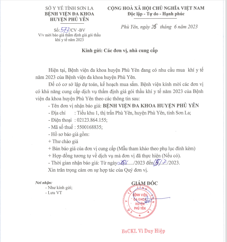 Mời báo giá thẩm định giá gói thầu khí y tế năm 2023