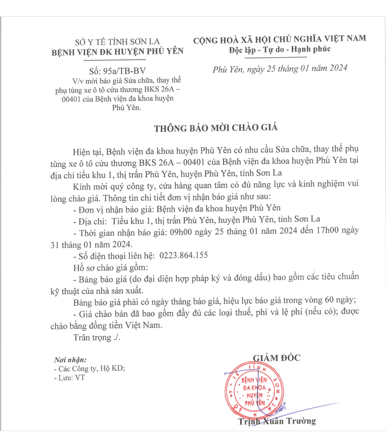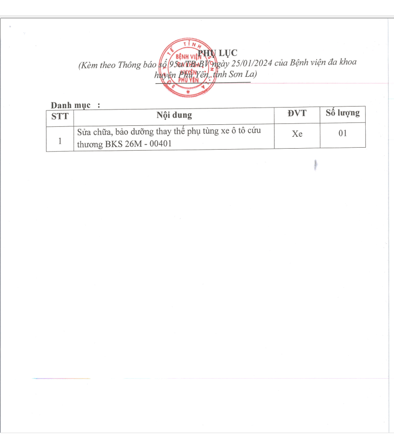 Mời báo giá Sửa chữa, thay thế phụ tùng xe ô tô cứu thương BKS 26A – 00401 của Bệnh viện đa khoa huyện Phù Yên