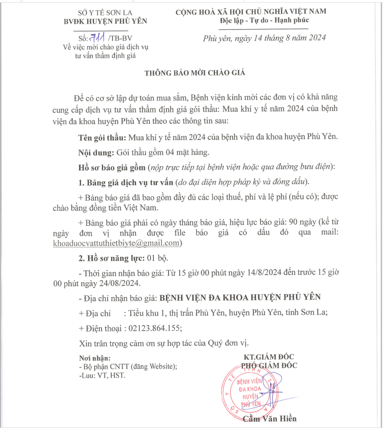 Về việc mời chào giá dịch vụ tư vấn thẩm định giá: Mua khí Y tế năm 2024 (Có phụ lục đính kèm)