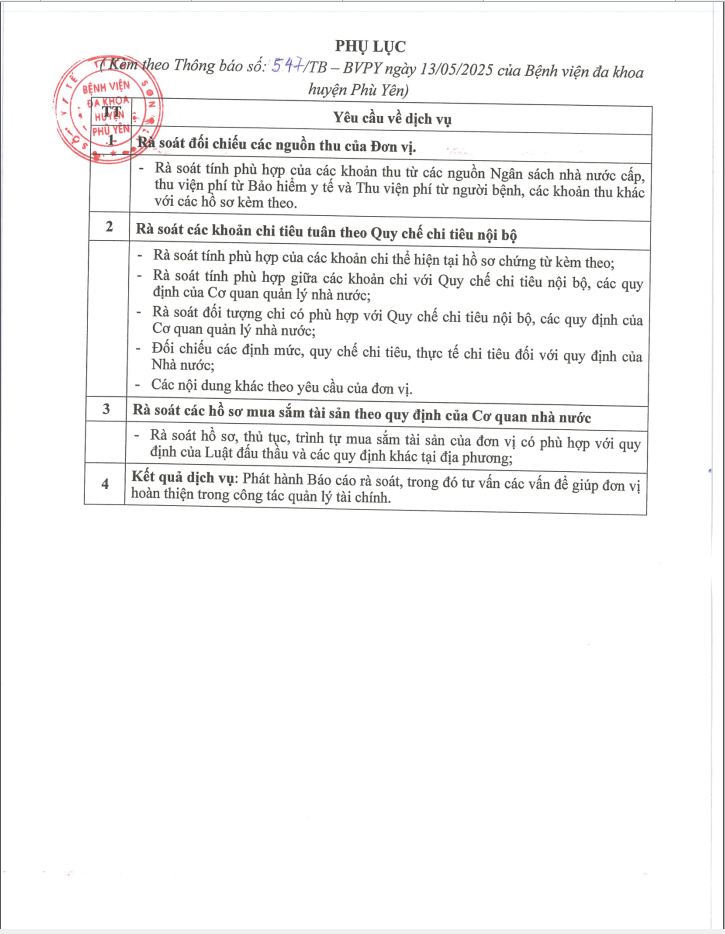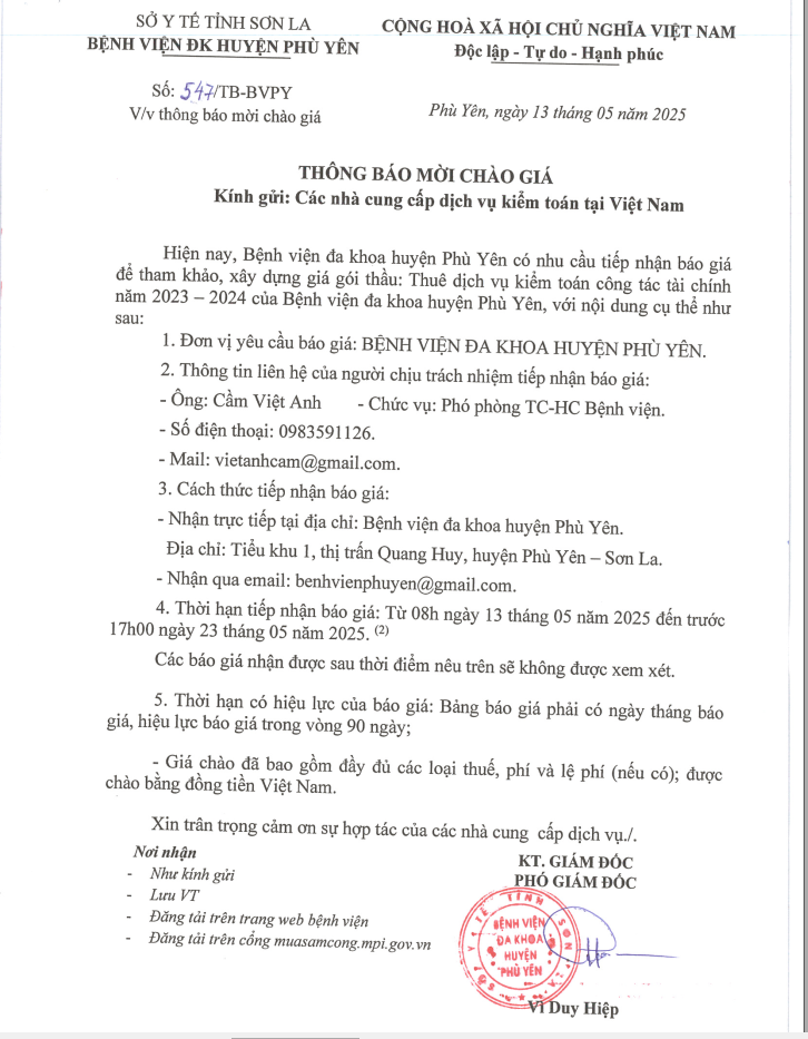 Thuê dịch vụ kiểm toán công tác tài chính năm 2023 - 2024 của Bệnh viện đa khoa huyện Phù Yên