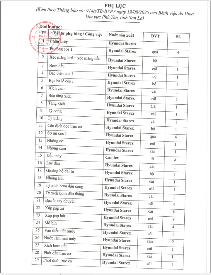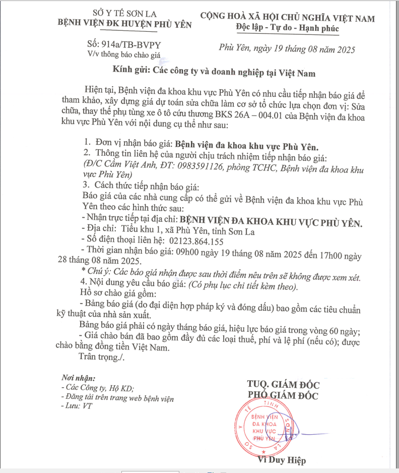 V/v Sửa chữa, thay thế phụ tùng xe ô tô cứu thương BKS 26A-00401 của Bệnh viện