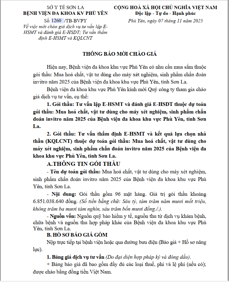 Về việc mời chào giá dịch vụ tư vấn lập EHSMT và đánh giá E-HSDT; Tư vấn thẩm định E-HSMT và KQLCNT