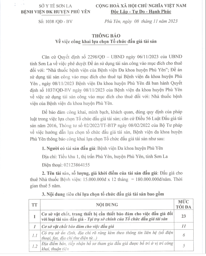 THÔNG BÁO: VỀ VIỆC CÔNG KHAI LỰA CHỌN TỔ CHỨC ĐẤU GIÁ TÀI SẢN NHÀ THUỐC BỆNH VIỆN