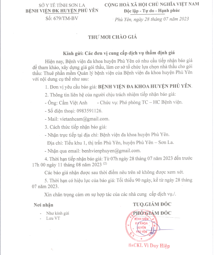 THƯ MỜI CHÀO GIÁ THẨM ĐỊNH GIÁ GÓI THẦU THUÊ PHẦN MỀM QUẢN LÝ BỆNH VIỆN