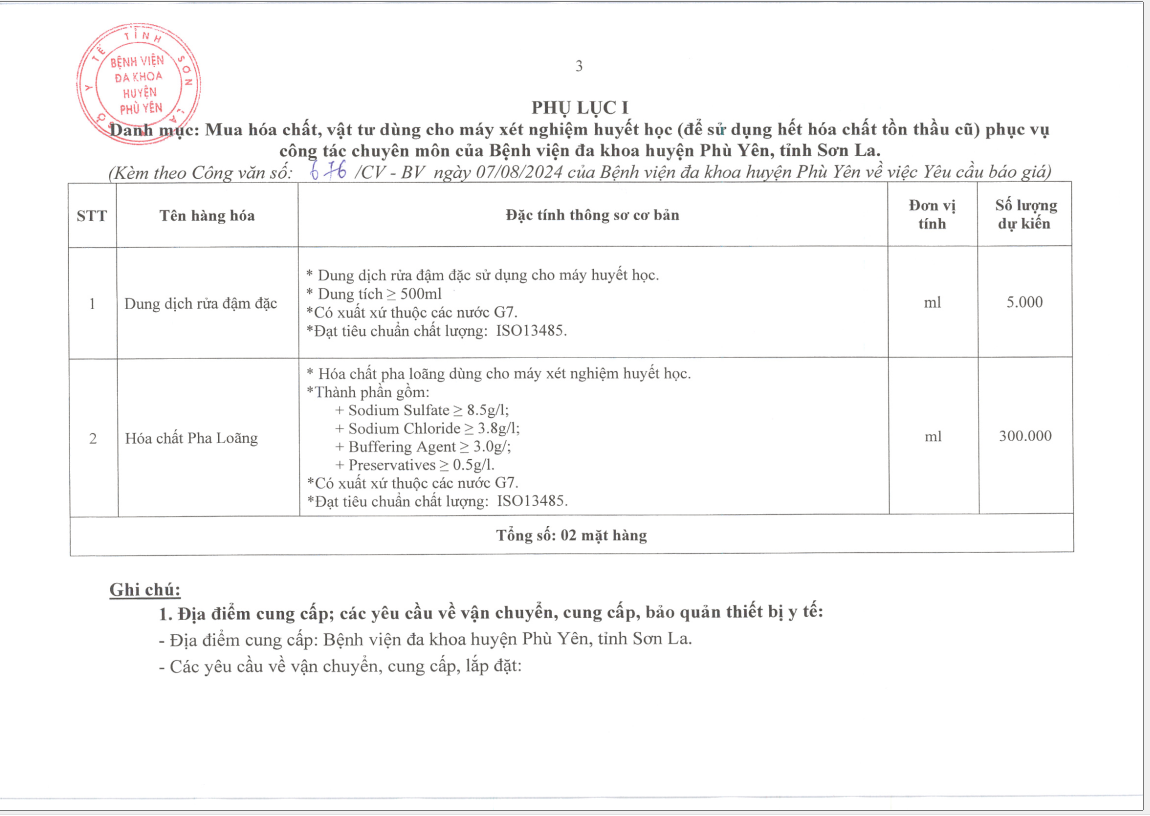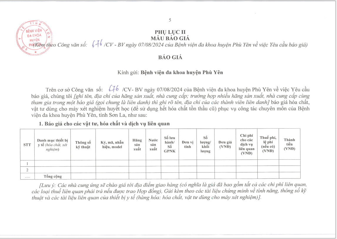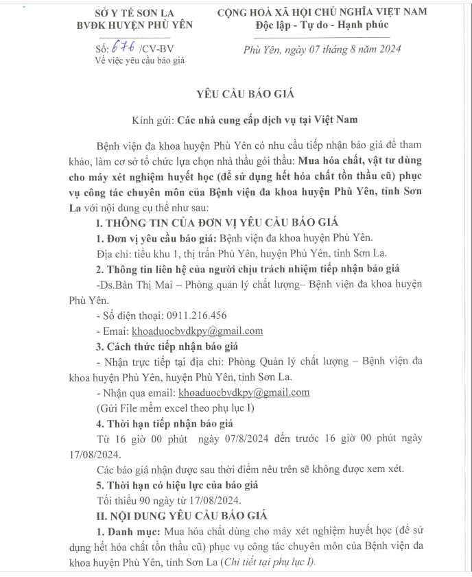 V/v yêu cầu báo giá: Mua hoá chất, vật tư dùng cho máy xét nghiệm huyết học( để sử dụng hết hoá chất tồn thầu cũ) phục vụ công tác chuyên môn của Bệnh viện