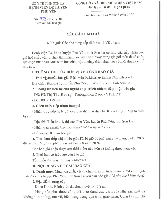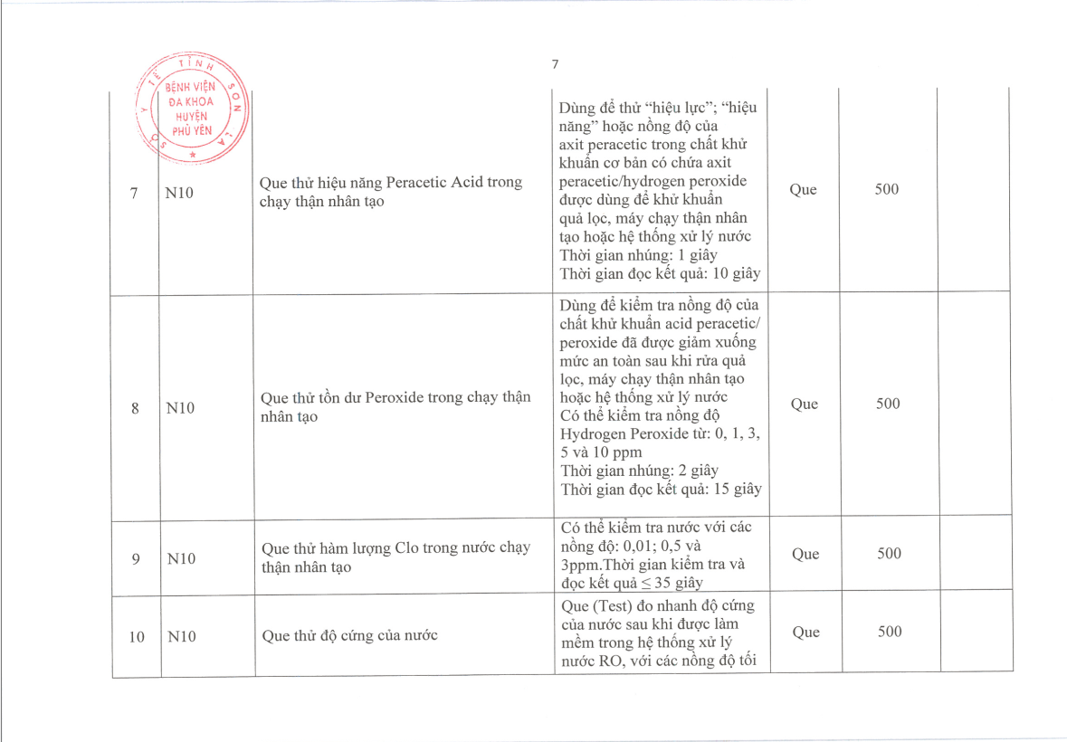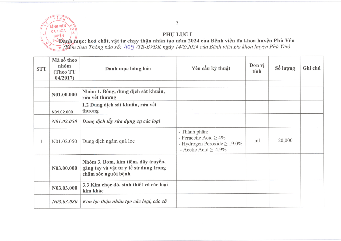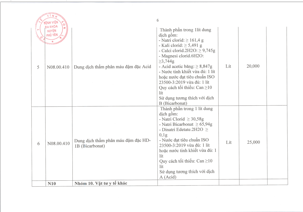 Yêu cầu báo giá: Mua sắm hoá chất, vật tư chạy thận nhân tạo