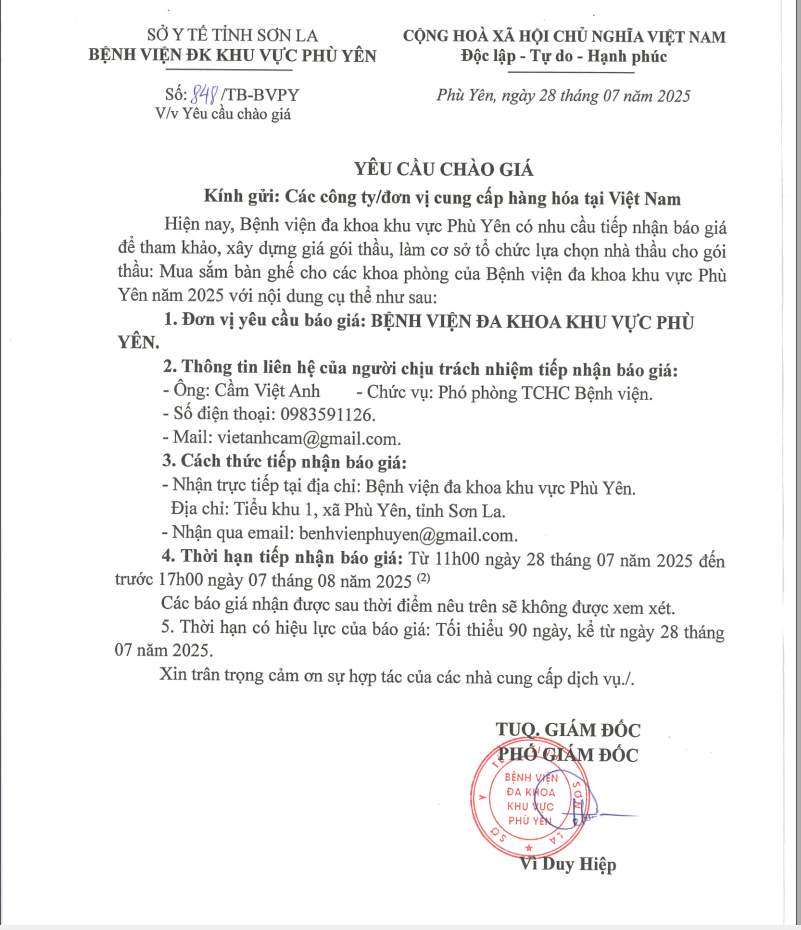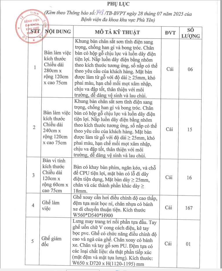 V/v Mua sắm bàn ghế cho các khoa phòng Bệnh viện đa khoa khu vực Phù Yên năm 2025