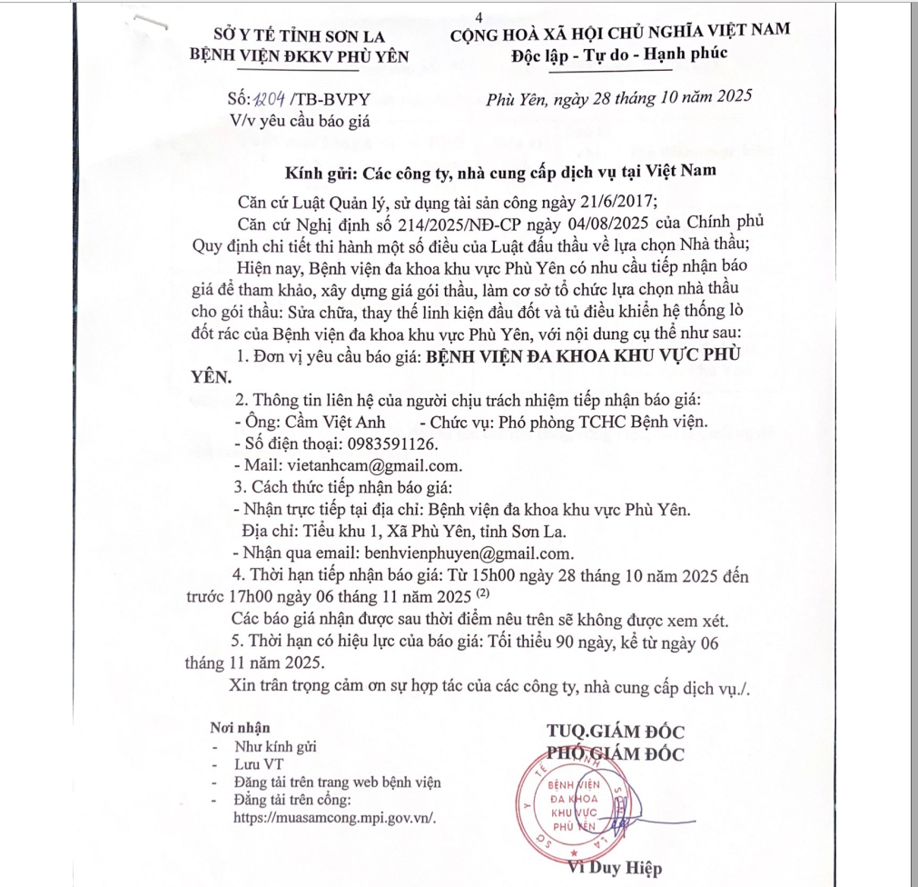 V/v Sửa chữa, thay thế linh kiện đầu đốt và tủ điều khiển hệ thống lò đốt rác của Bệnh viện đa khoa khu vực Phù Yên,